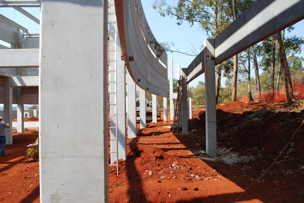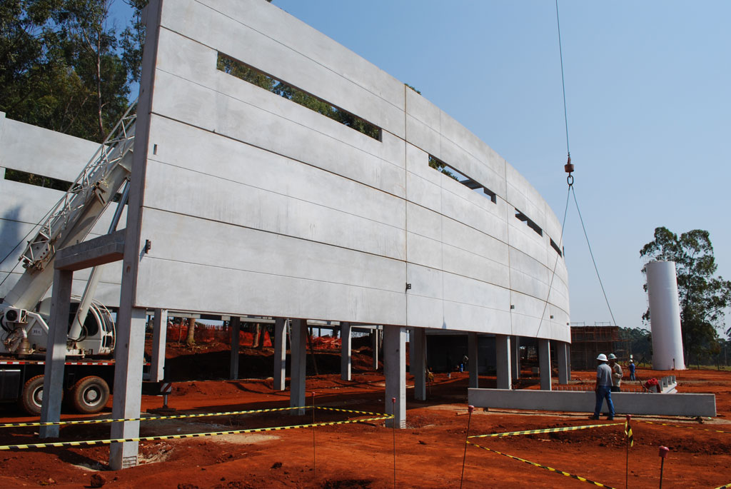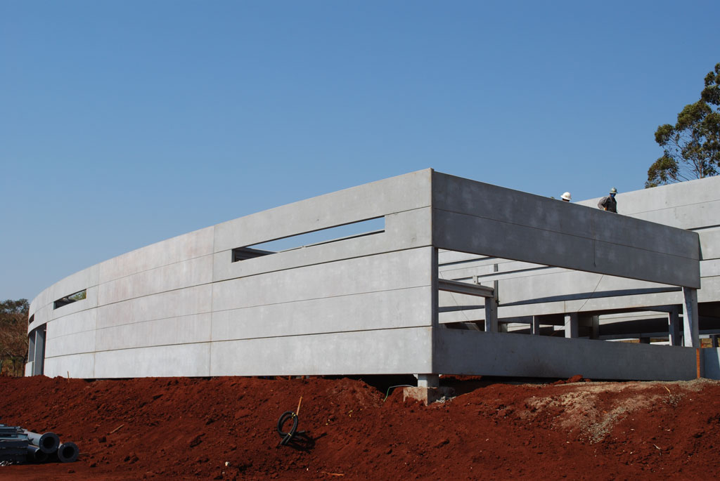 Descrição:Estrutura pré-moldada de concreto com painéis curvos, côncavos e convexos, com curvaturas diferentes em cada fachada.