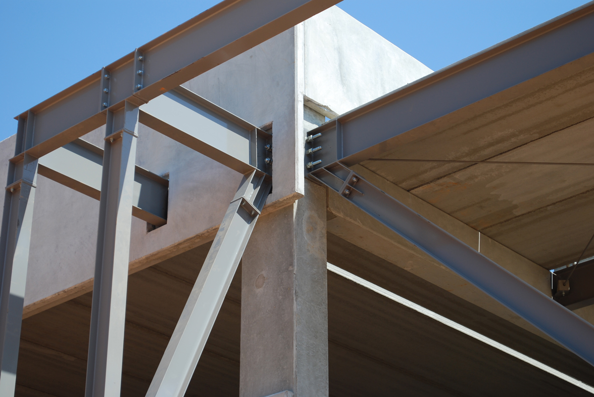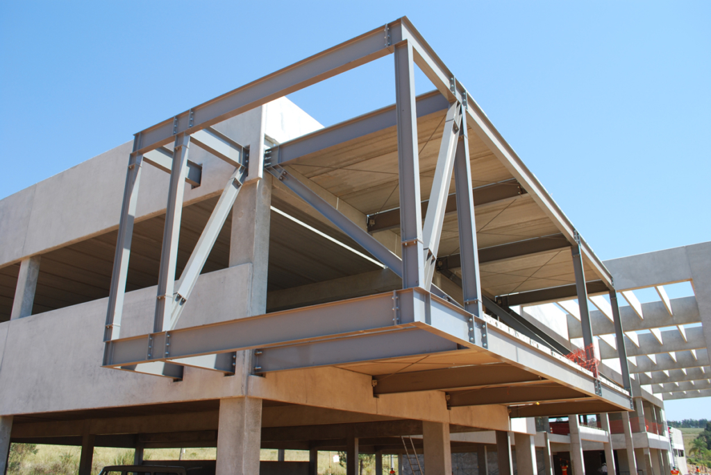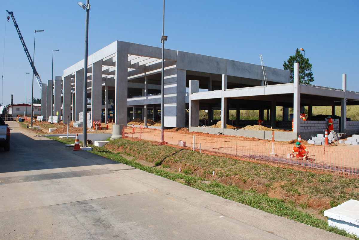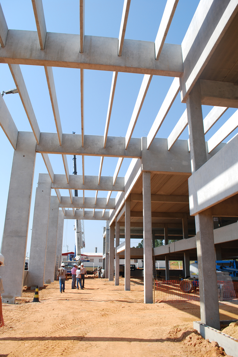 Descrição: Estruturas pré-moldadas de concreto com administrativo em estrutura metálica em balanço.