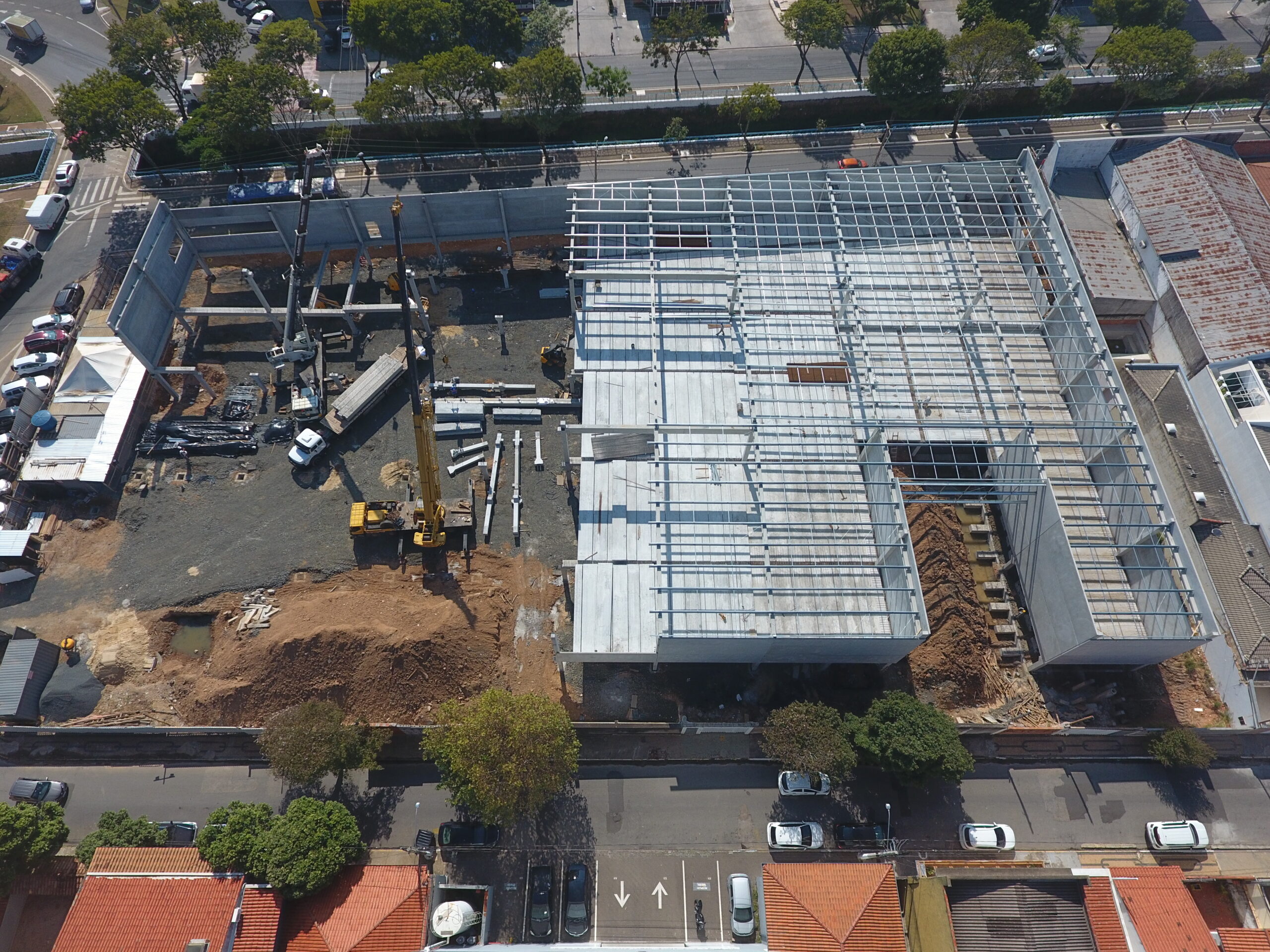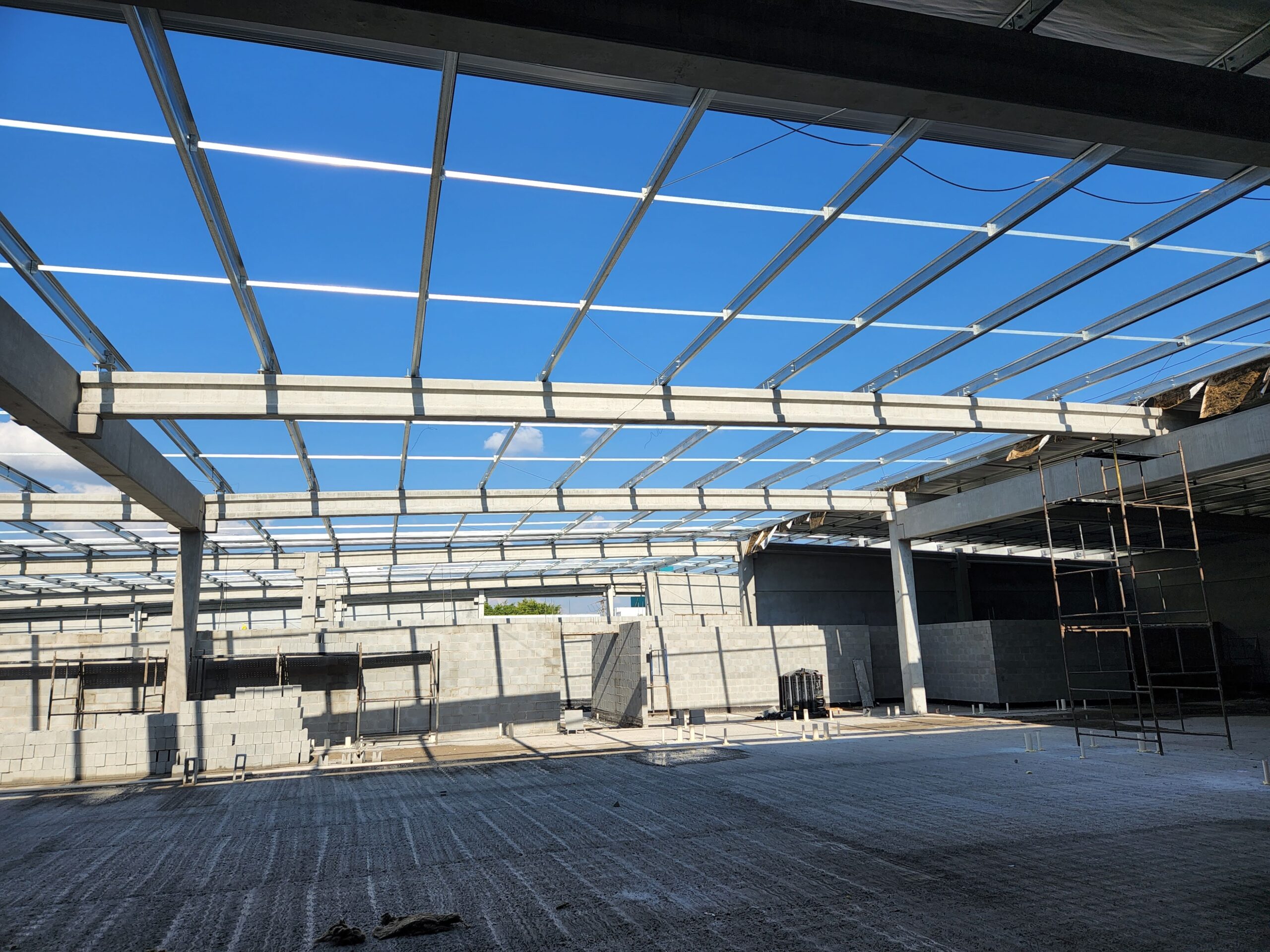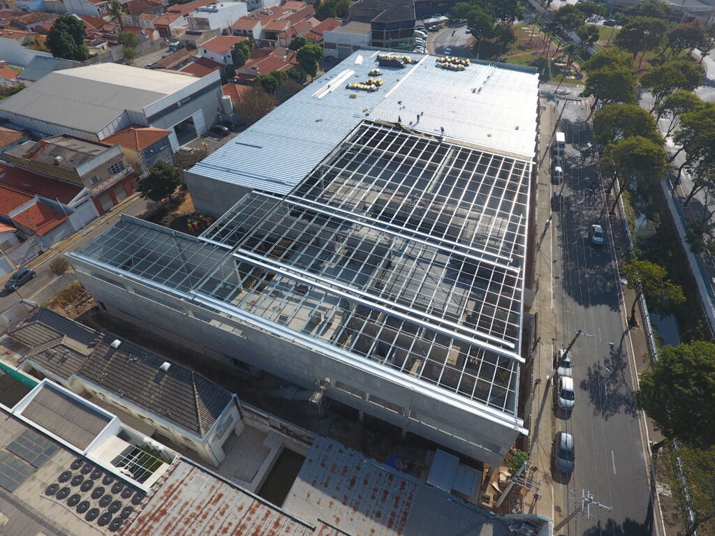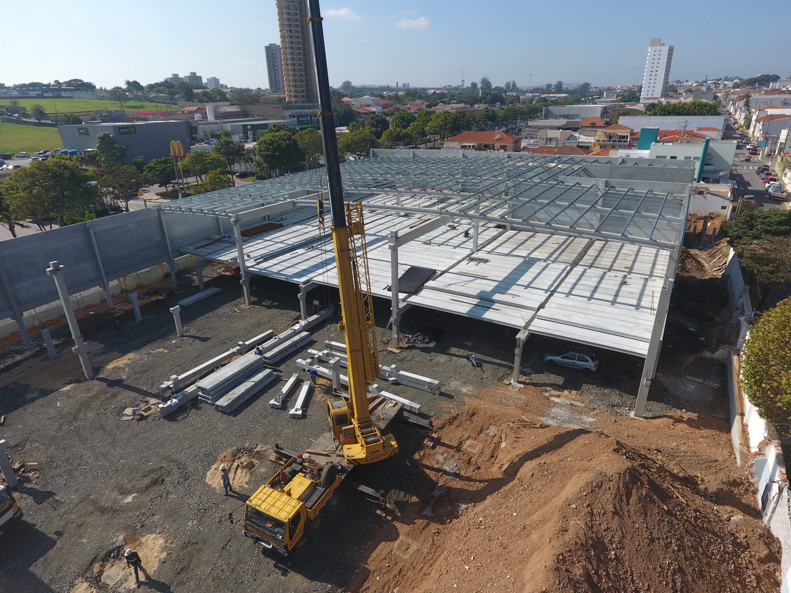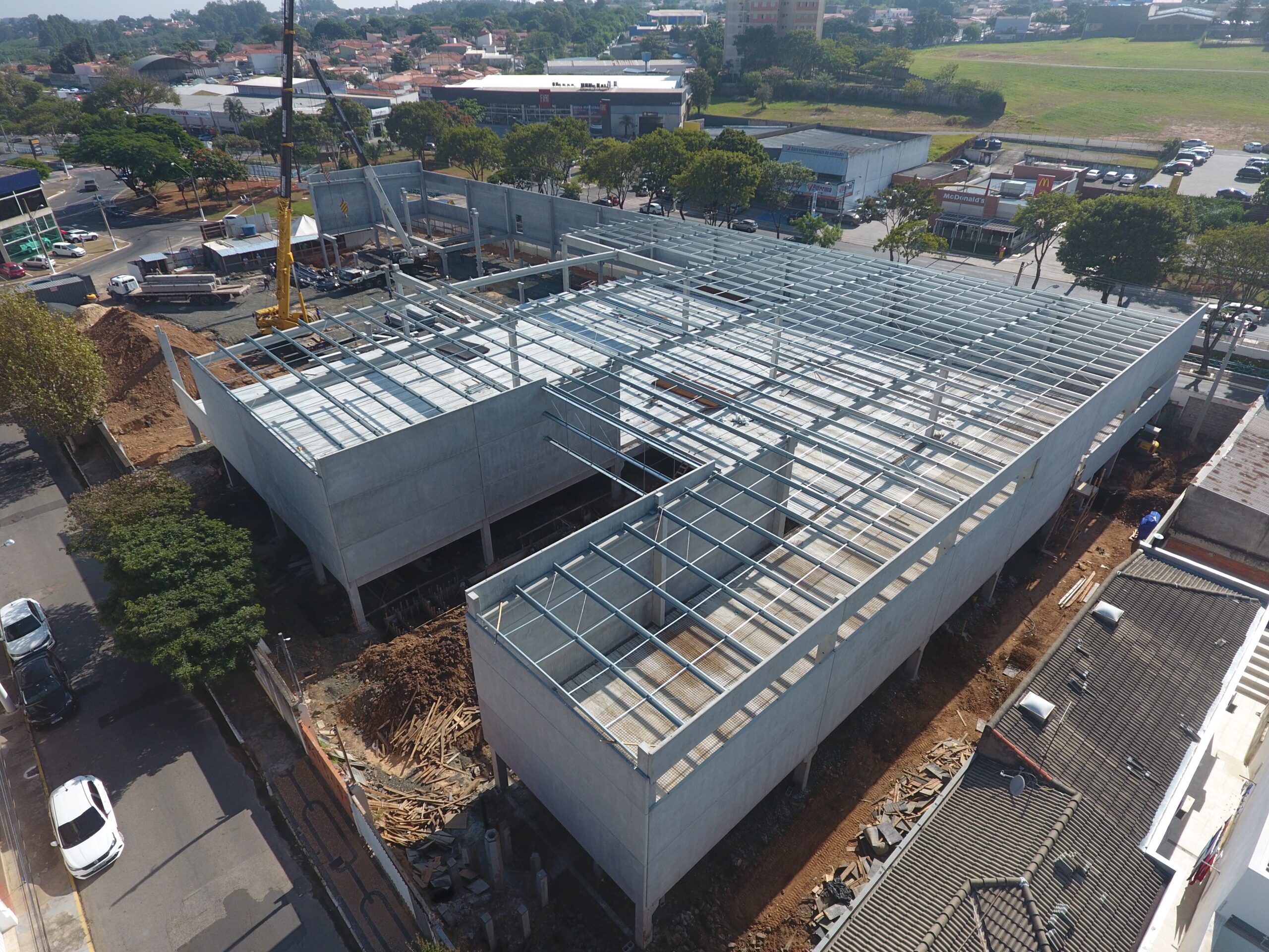 Descrição: Estruturas pré-moldadas de concreto com painéis maciços de fechamento, cobertura em solução com terças metálicas e telhas zipadas.