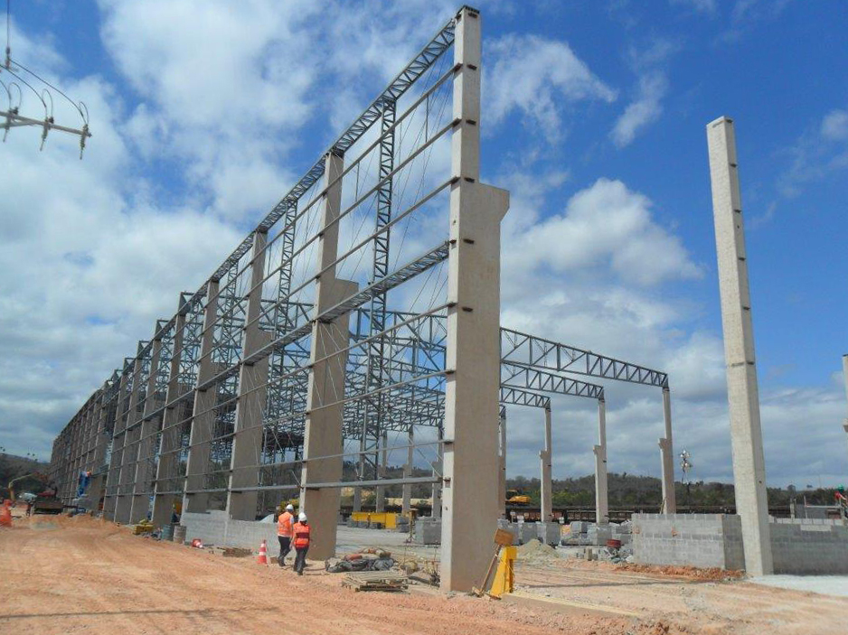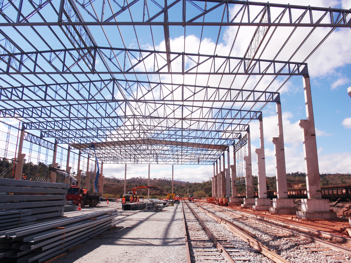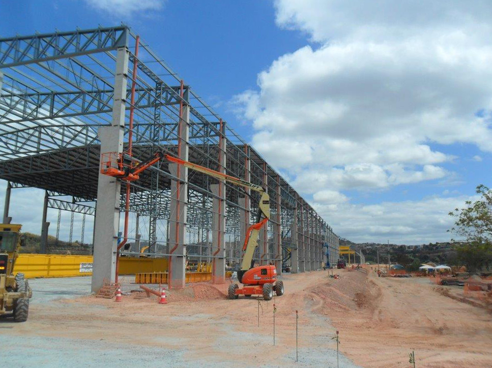 Descrição: Estrutura metálica de cobertura com vão de 50,00 m e pé-direito de 18,00 m.